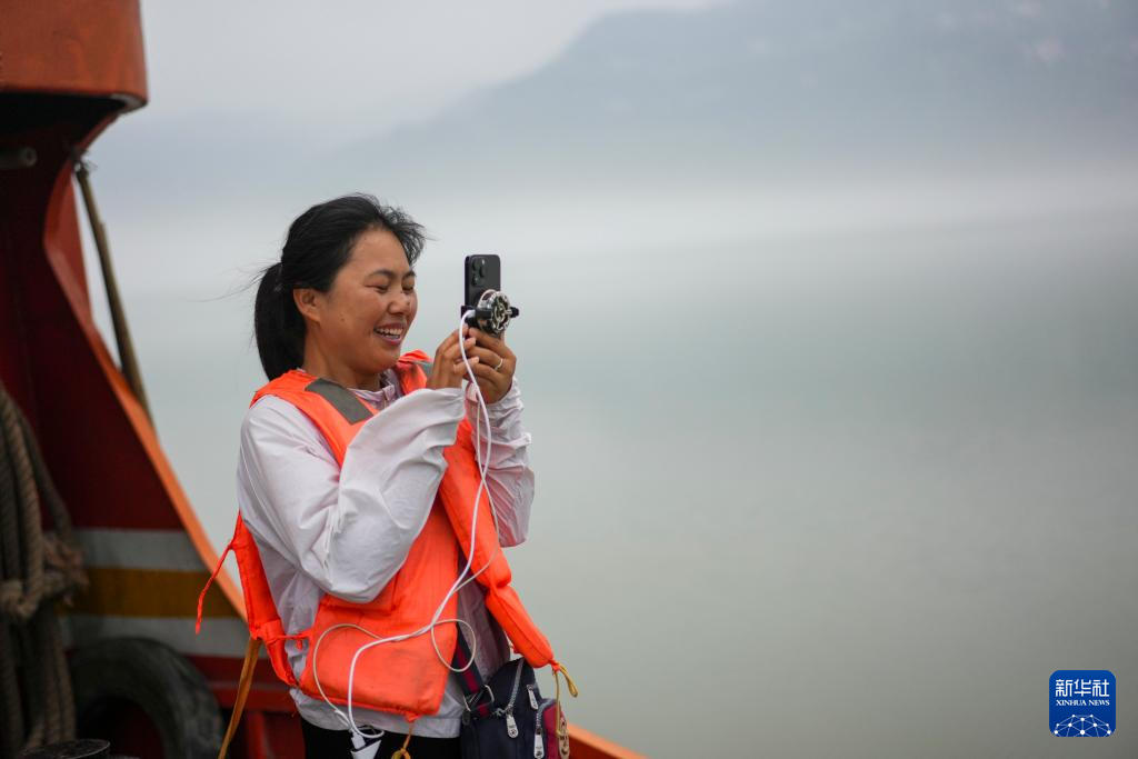 7月10日,“渝忠客2180”客轮开行中,曹利芳站在船头用手机向网民们展示薄雾中迷人的长江景色。