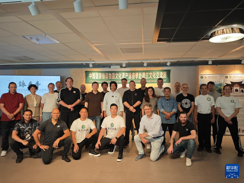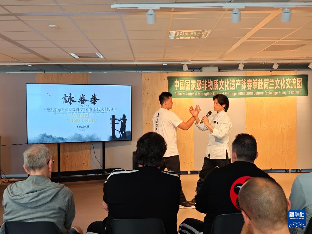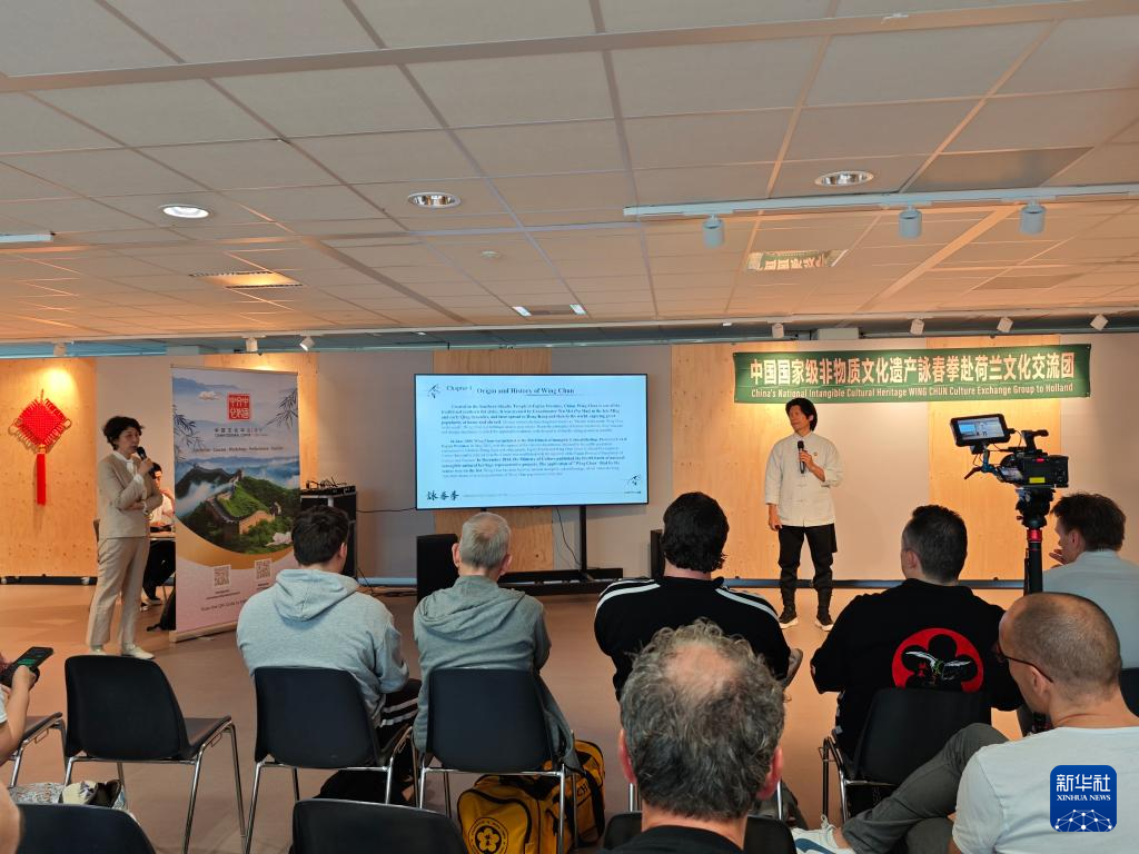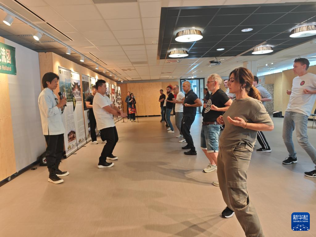 7月10日,咏春拳传承人郑祖杰(左一)在荷兰海牙中国文化中心开展交流活动。