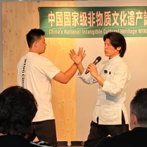 7月10日,咏春拳传承人郑祖杰(右)在荷兰海牙中国文化中心开展交流活动。
