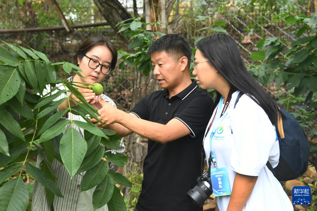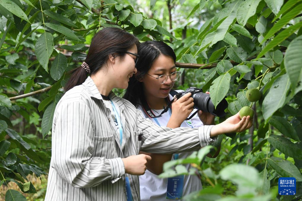 7月12日,在北京市平谷区熊儿寨乡熊儿寨村的一处核桃林,中国传媒大学学生邵诗轩(左)和陈思樾(右)与村民交流核桃种植经验。
