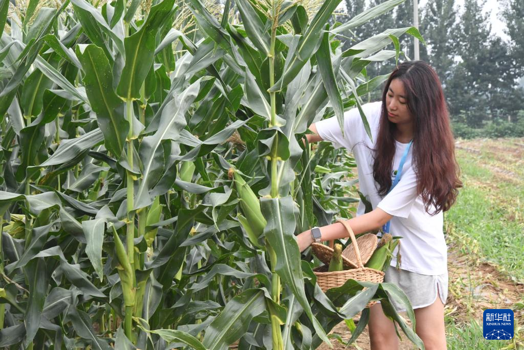 7月11日,在北京市平谷区平谷镇北台头村的一处玉米地,中国农业大学学生姜黎雨在采摘玉米。