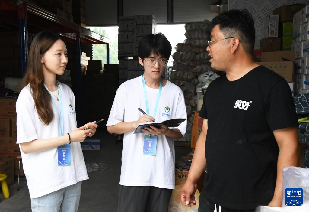 7月11日,中央财经大学学生王思琪(左)与同学陈云涛(中)在北京市平谷区平谷镇东寺渠批发市场调研。