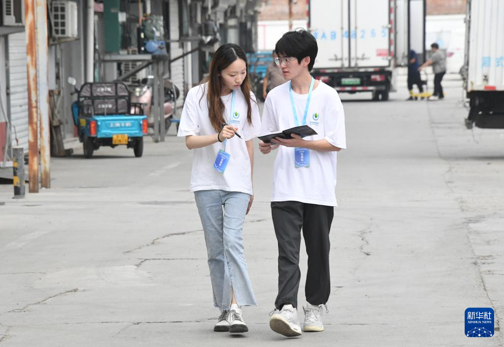7月11日,中央财经大学学生王思琪(左)与同学陈云涛在北京市平谷区平谷镇东寺渠批发市场进行调研。