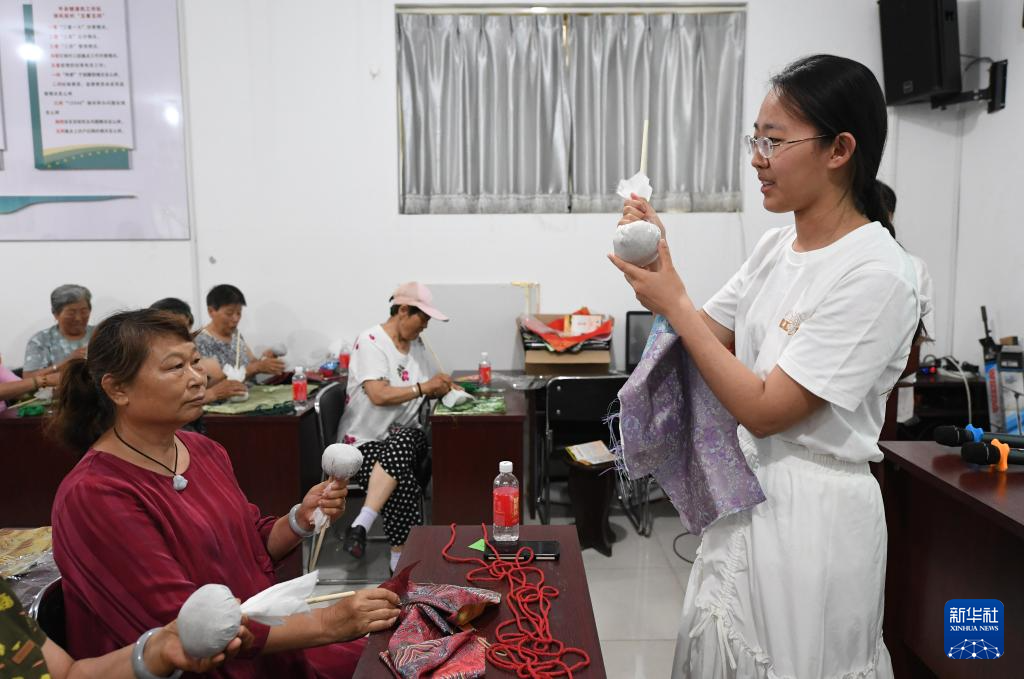 7月11日,在北京市平谷区平谷镇东寺渠村村委会,中央财经大学学生李研(左一)为村民上“村课”。