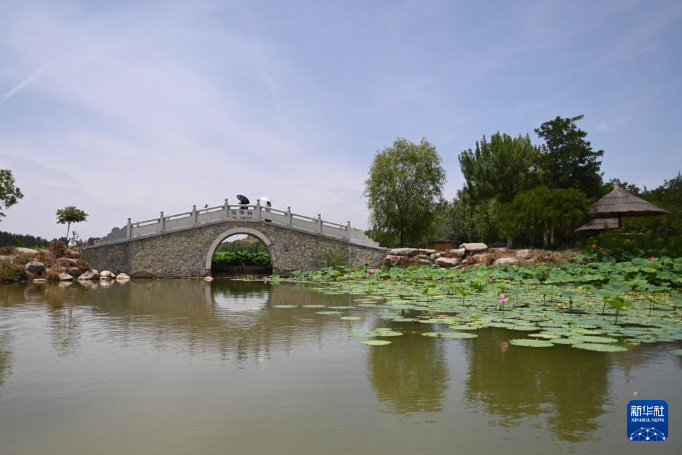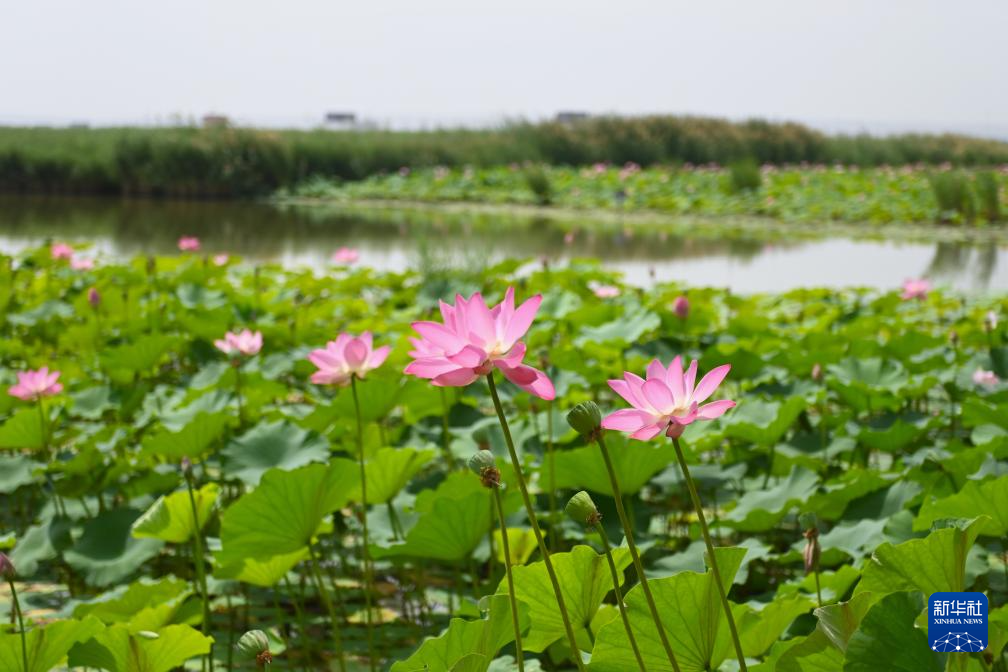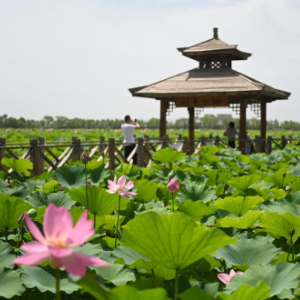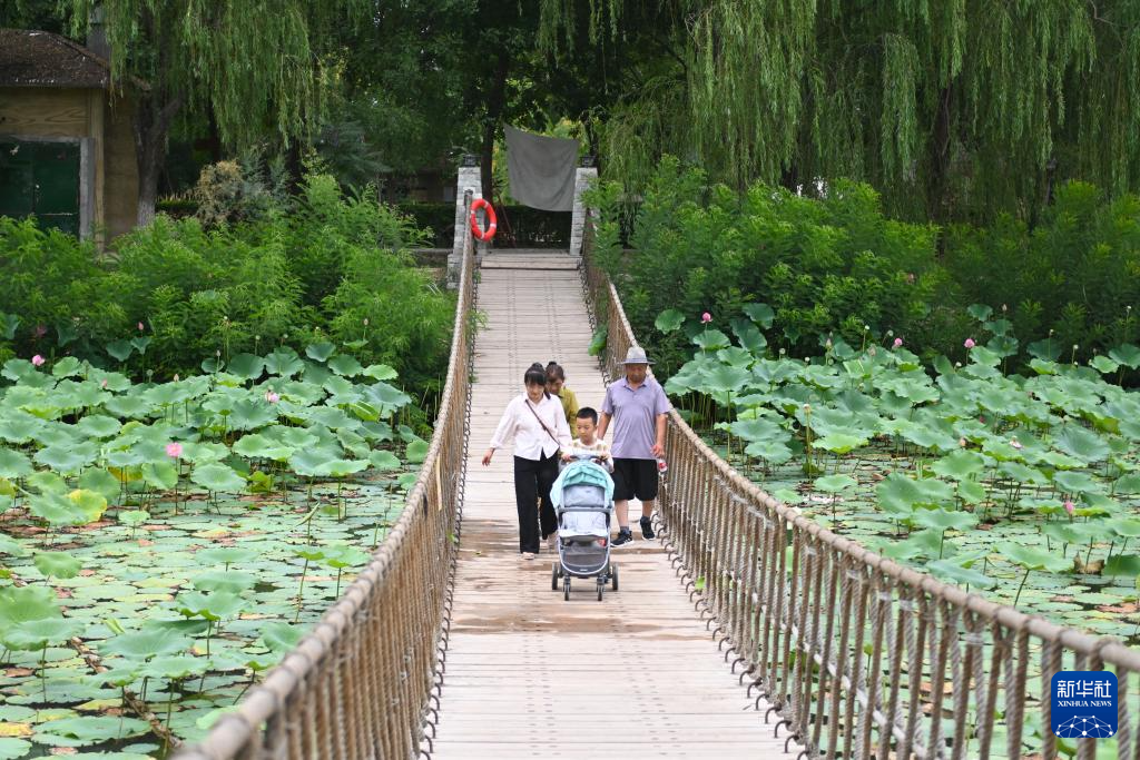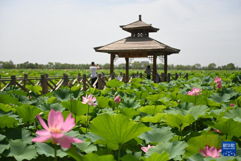 近日,位于宁夏银川的鸣翠湖国家湿地公园荷花陆续开放,吸引游客前来赏花拍照,感受湖城盛夏之美。