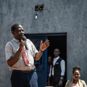 7月13日,在卢旺达吉昆比,独立候选人菲利普·姆帕伊马纳(右一)进行竞选演讲。