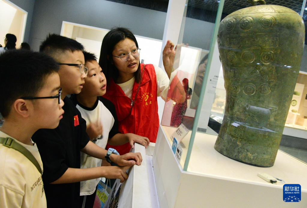 7月14日,在江苏省镇江博物馆,江苏大学志愿者为小朋友介绍文物。
