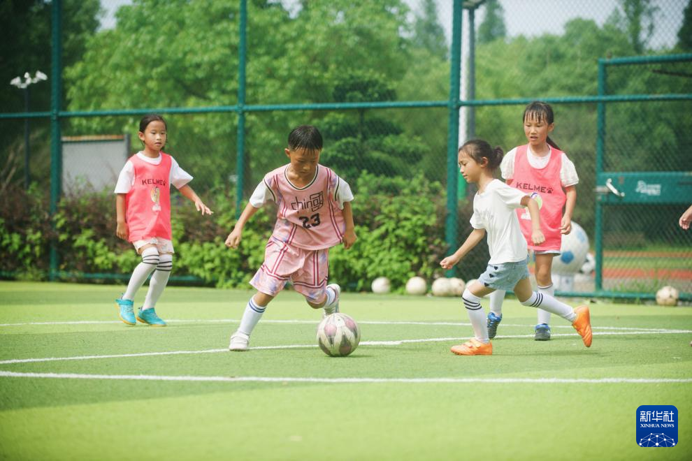 7月14日,浙江省余姚市肖东第二小学的学生在进行足球训练。