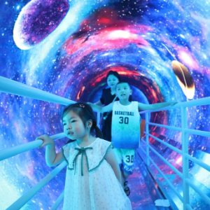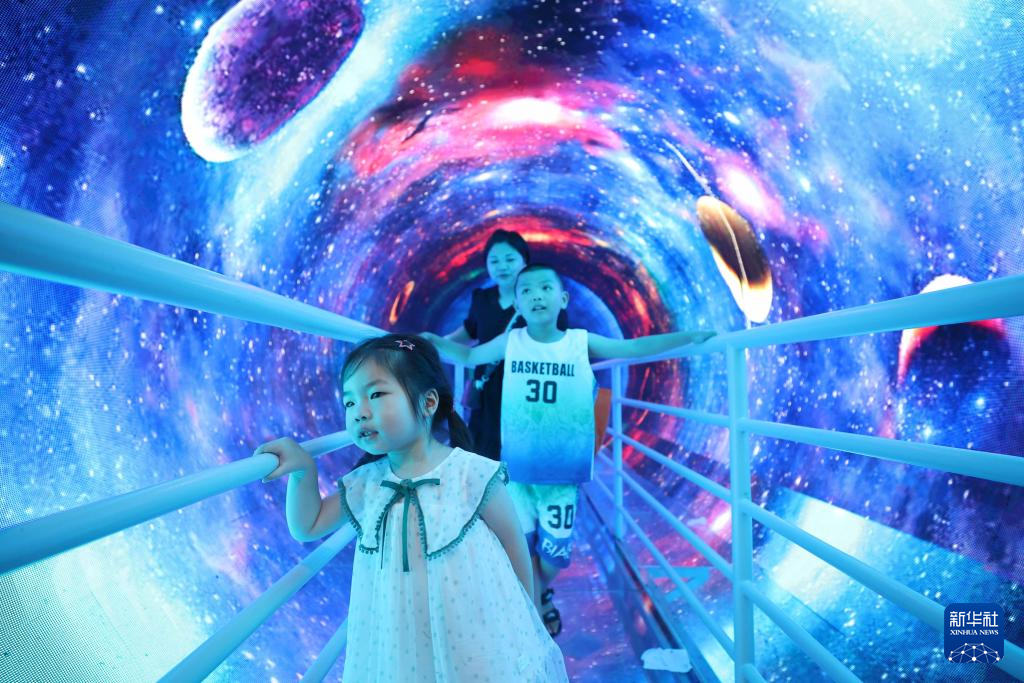 7月13日,小朋友在福建厦门科技馆体验“时光隧道”。