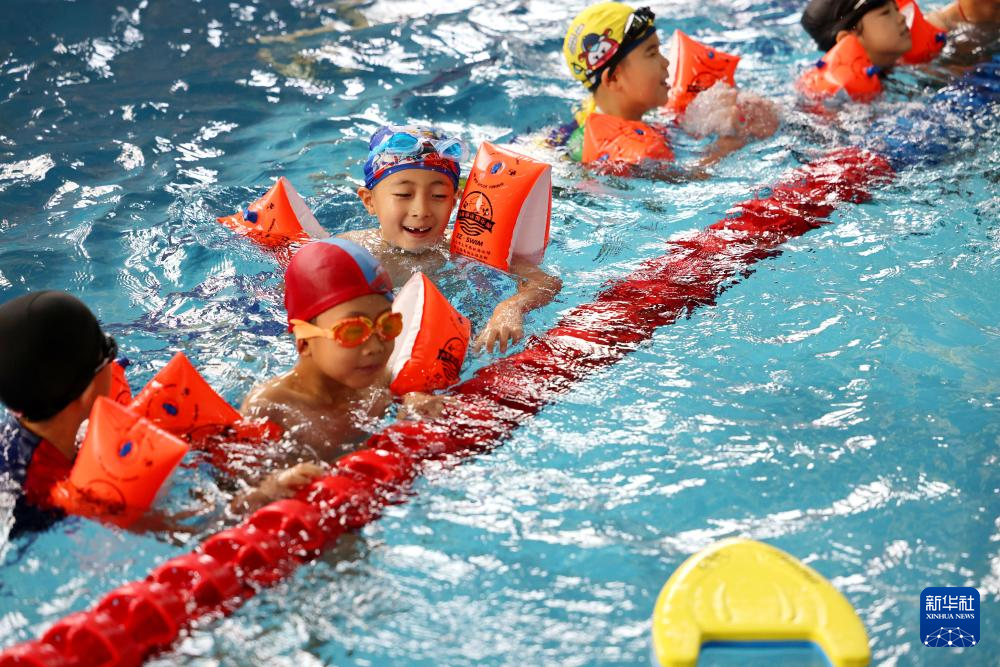 7月14日,孩子们在山东省枣庄市一家游泳馆学习游泳。