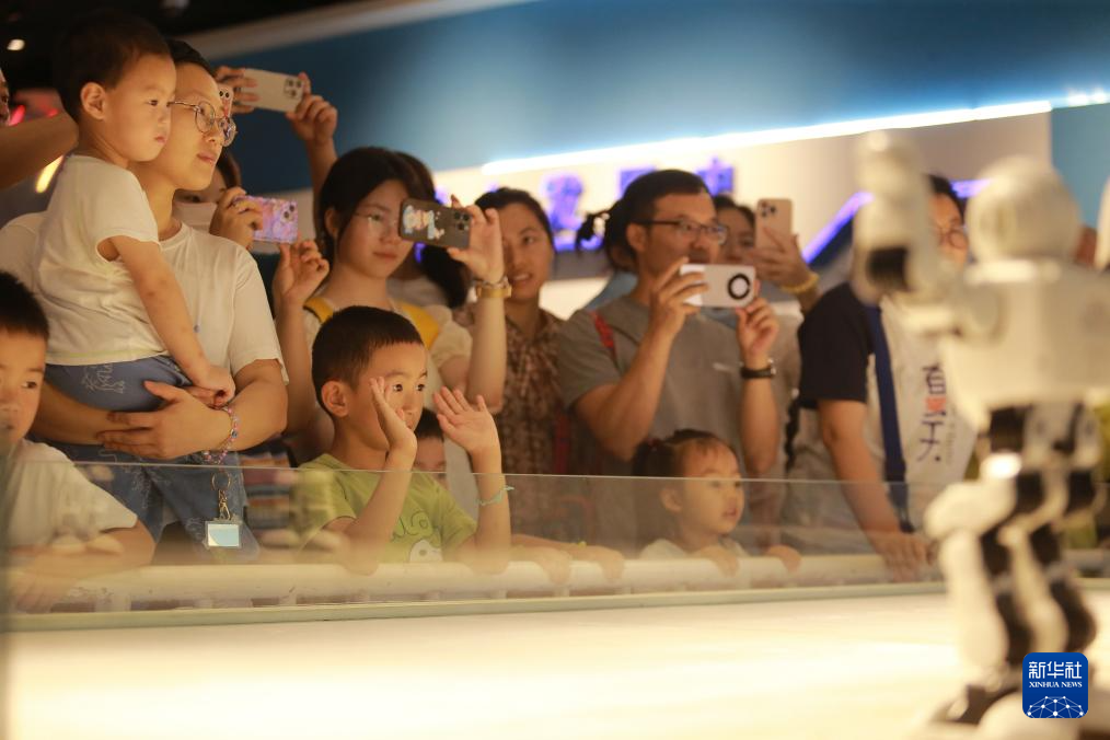 7月14日,小朋友和家长在江苏省扬州科技馆内观看机器人跳舞。