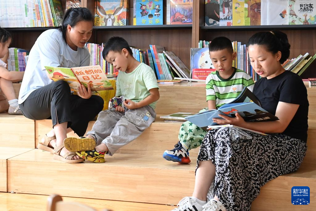 7月14日,在浙江省东阳市新华书店内,小孩子在家长陪伴下阅读。
