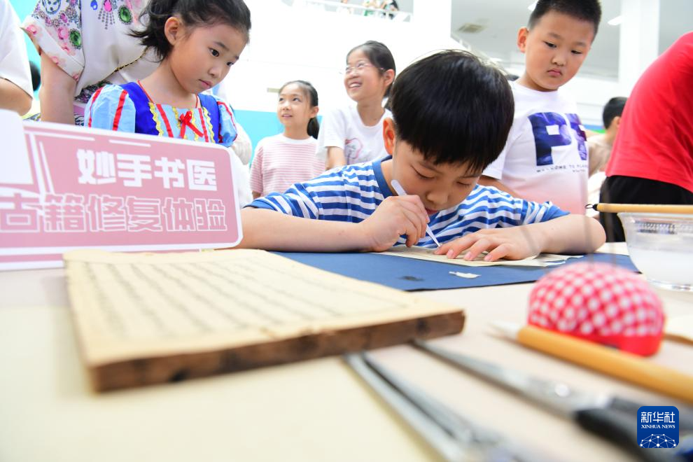 7月14日,小朋友在无锡市图书馆体验“妙手书医”古籍修复技艺。