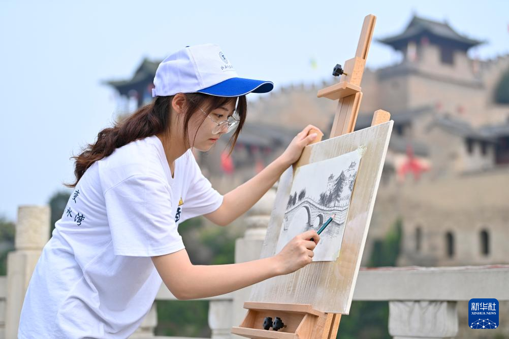 山西科技学院的学生在湘峪古堡写生(7月10日摄)。