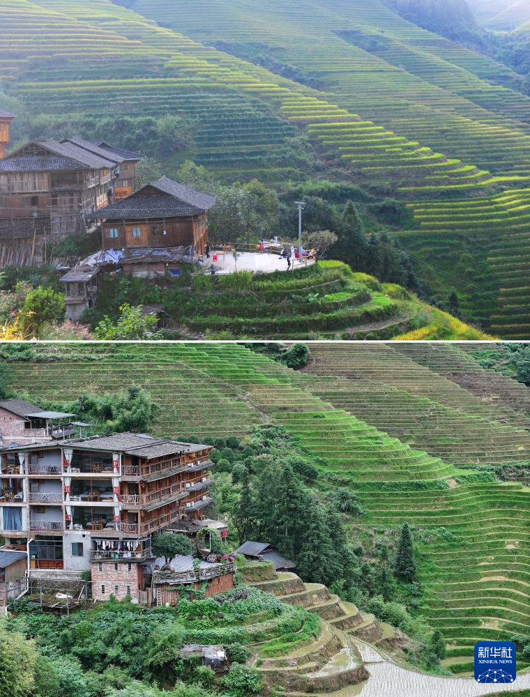 拼版照片:这是2013年(上图,资料照片)和2024年拍摄的大寨村民宿和梯田(下图,新华社记者曹祎铭摄)。从照片里可以看到,虽然民宿数量有一定变化,但整体的建筑风格仍保持统一。