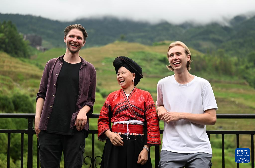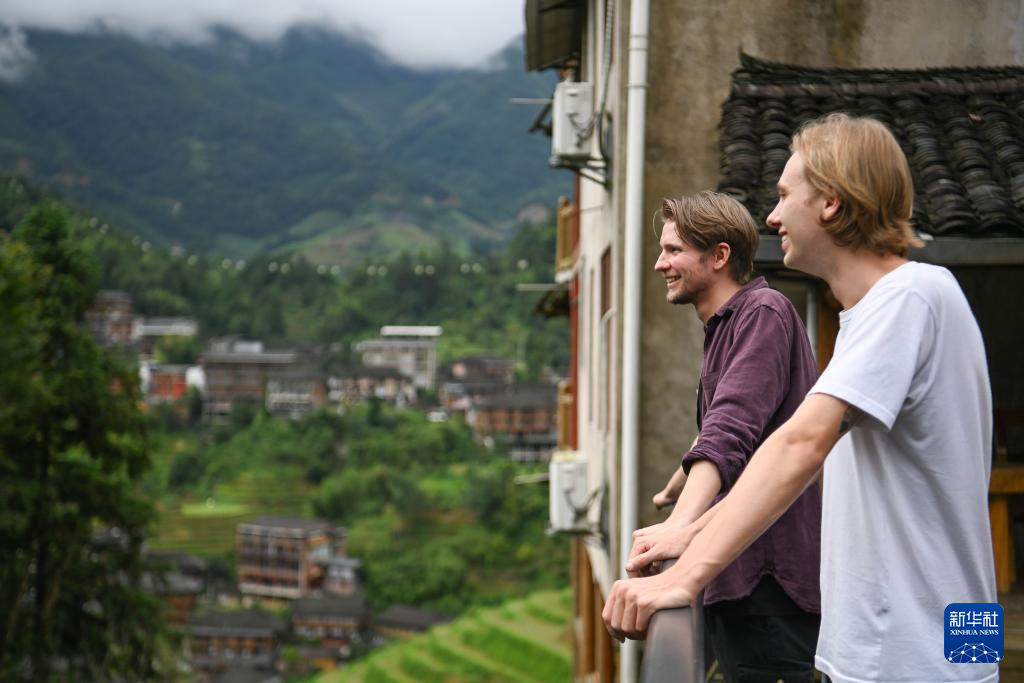来自德国的游客在大寨村的一家民宿赏景(6月26日摄)。