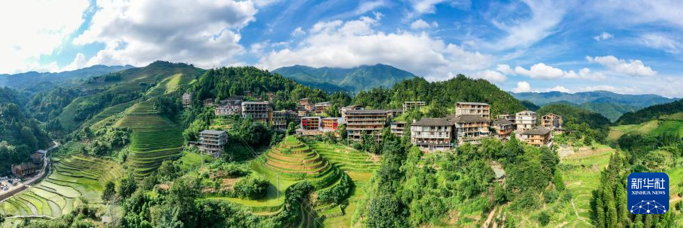 这是7月10日在大寨村拍摄的梯田和民宿(无人机全景照片)。