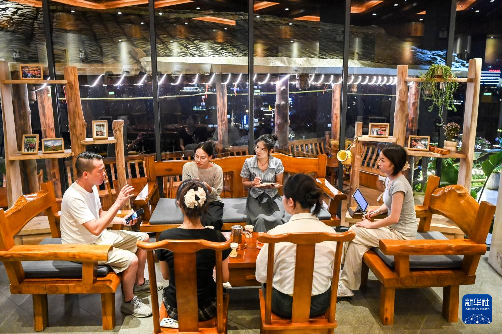 7月10日,在大寨村“山中已千年”观景民宿,民宿负责人余琼通(左一)与今年刚招聘来的大学毕业生交流。