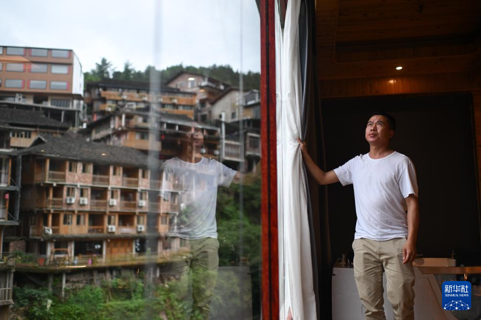 大寨村“山中已千年”观景民宿负责人余琼通整理客房窗帘(6月26日摄)。