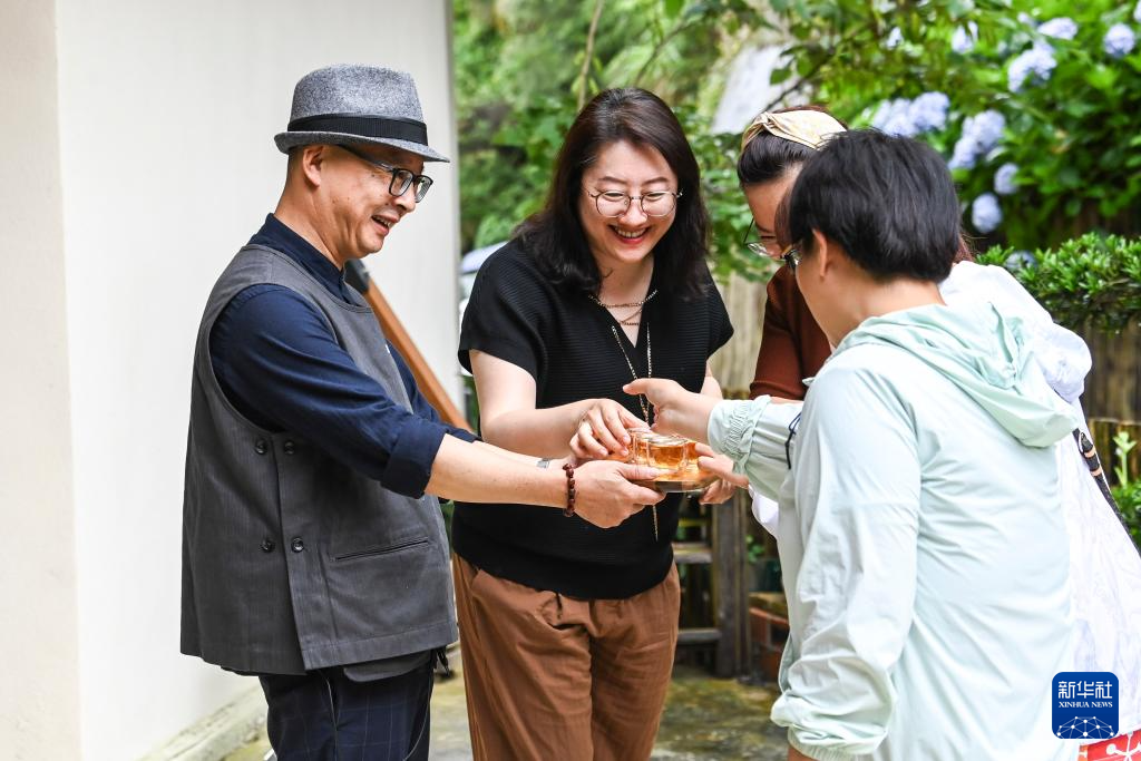 大寨村“陌野·晨曦”民宿管家李滨(左一)为入住的客人送茶水(6月26日摄)。