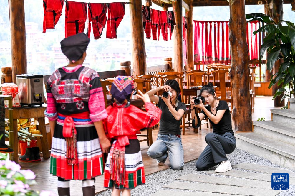 7月11日,在大寨村“山中已千年”观景民宿,两名刚毕业的大学生应聘到此工作,为游客拍照。