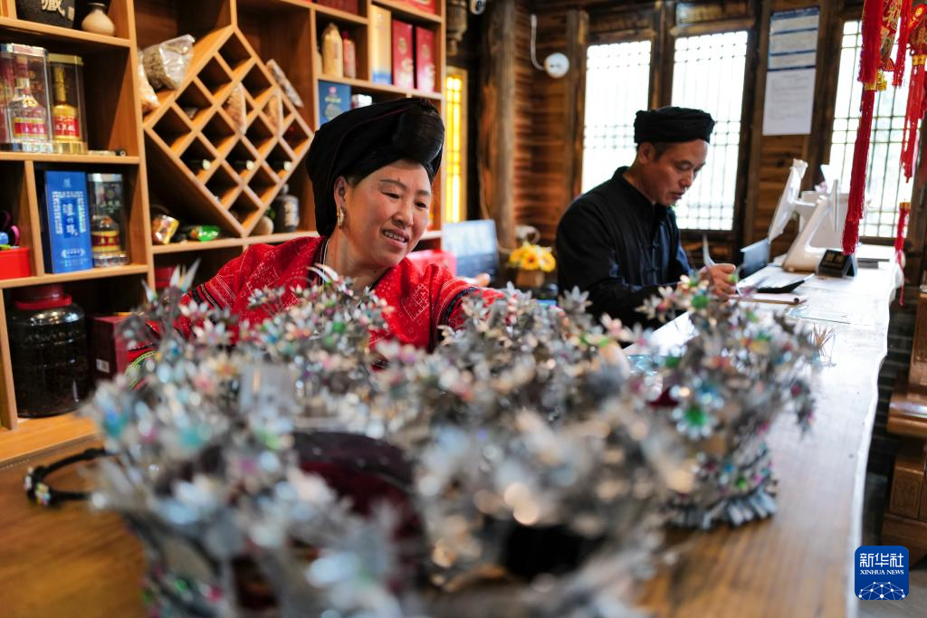 大寨村的老支书潘宝玉(右)和妻子潘保芬在自家民宿前台工作(6月26日摄)。他们是村里最早的民宿经营者。