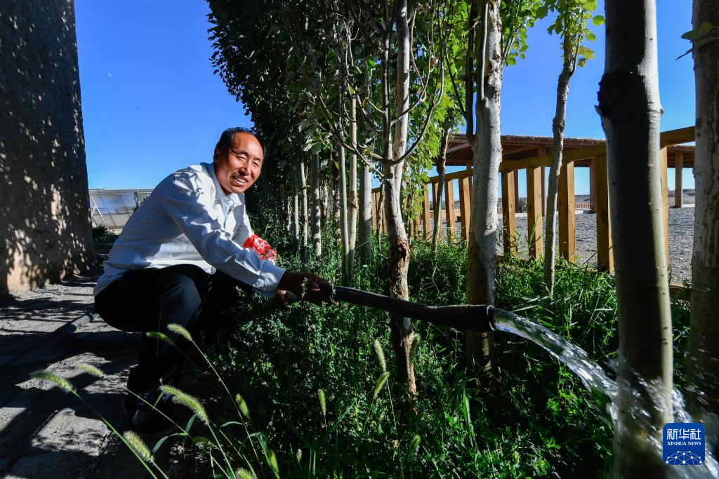 7月16日,张吉全为亲手栽植的白杨树浇水。