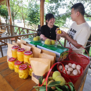 7月17日,在诸暨市同山镇云上居农庄内,党员志愿者进行助农直播,助力黄桃及多种特色农产品销售。