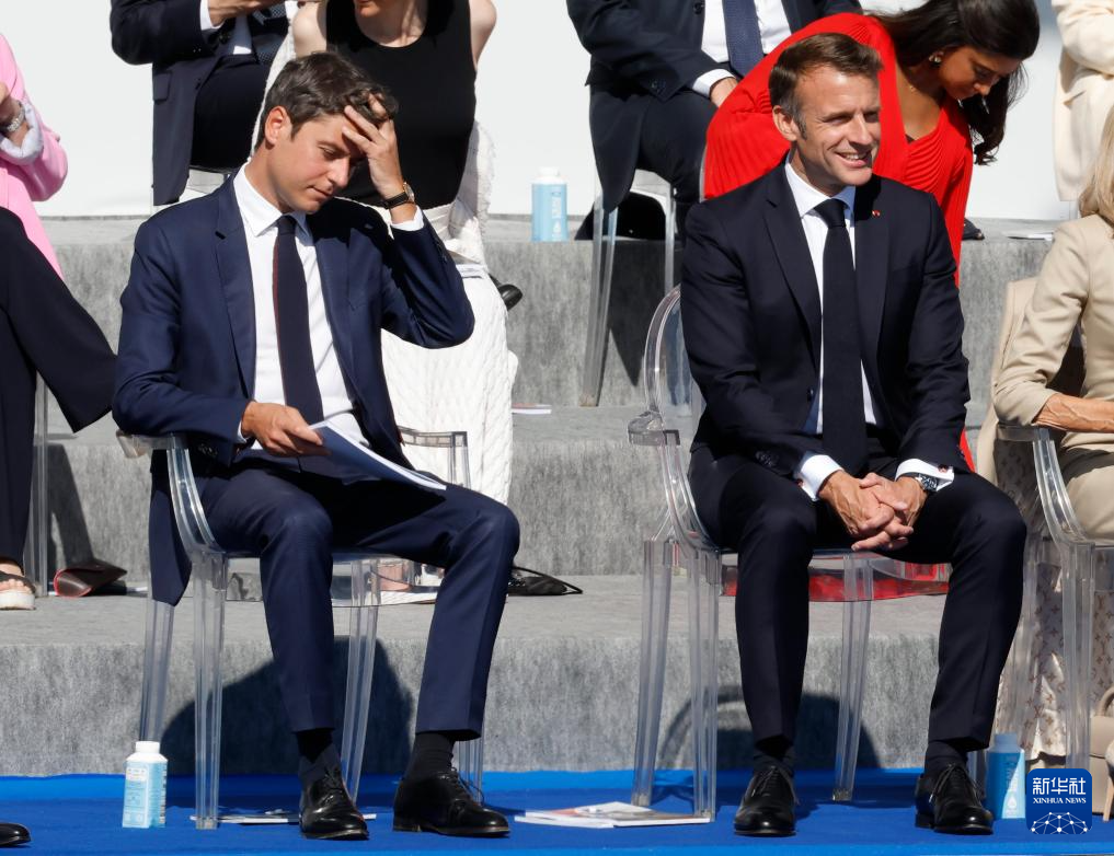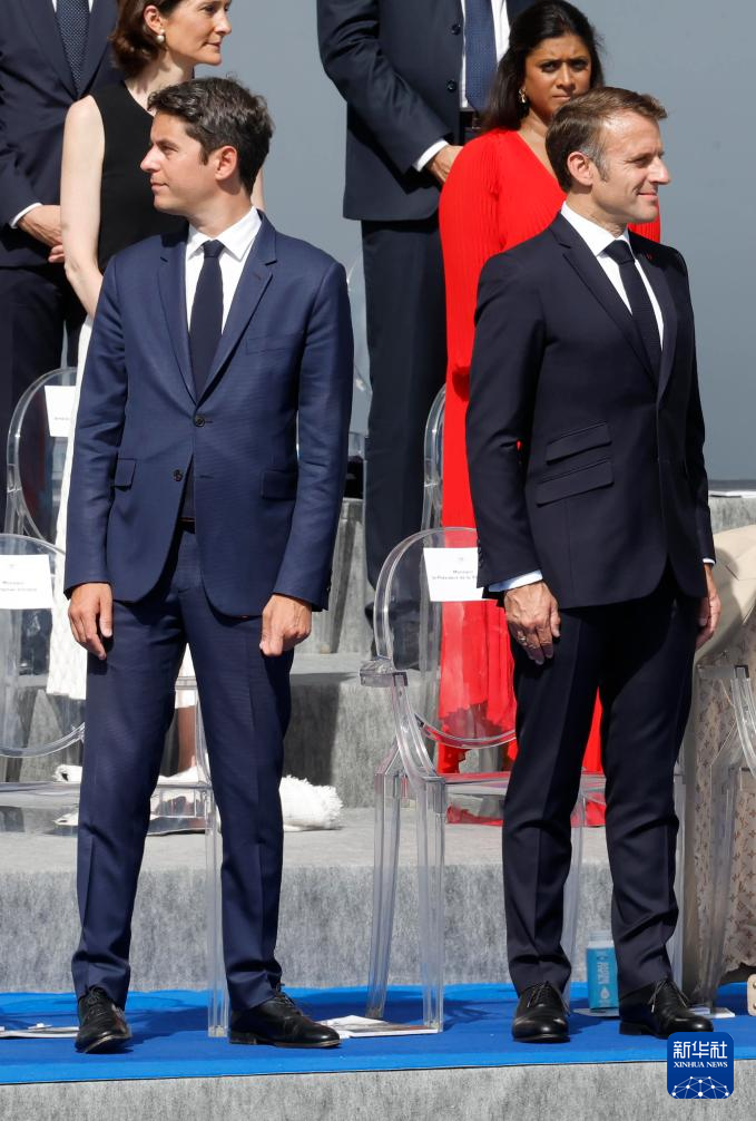 在法国巴黎凯旋门附近,法国总统马克龙(右)和总理阿塔尔出席国庆节阅兵式(7月14日摄)。