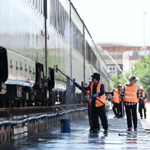 暑运期间,铁路客流增多。中国铁路北京局集团有限公司天津客运段积极做好列车清洁工作,保障铁路暑运。