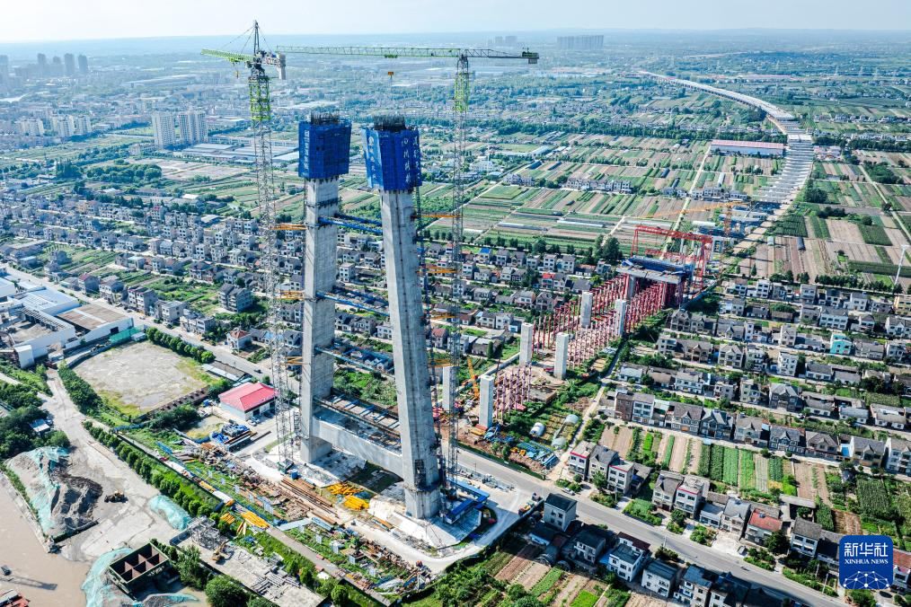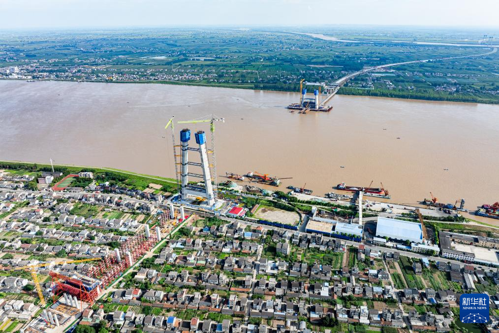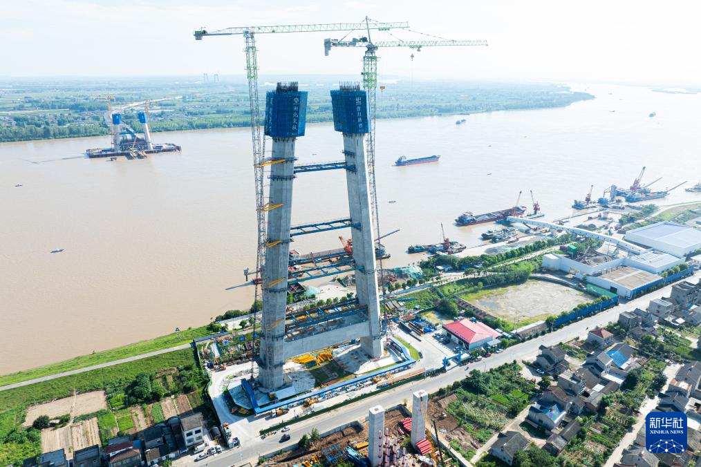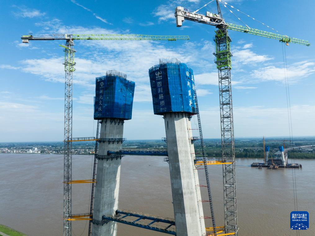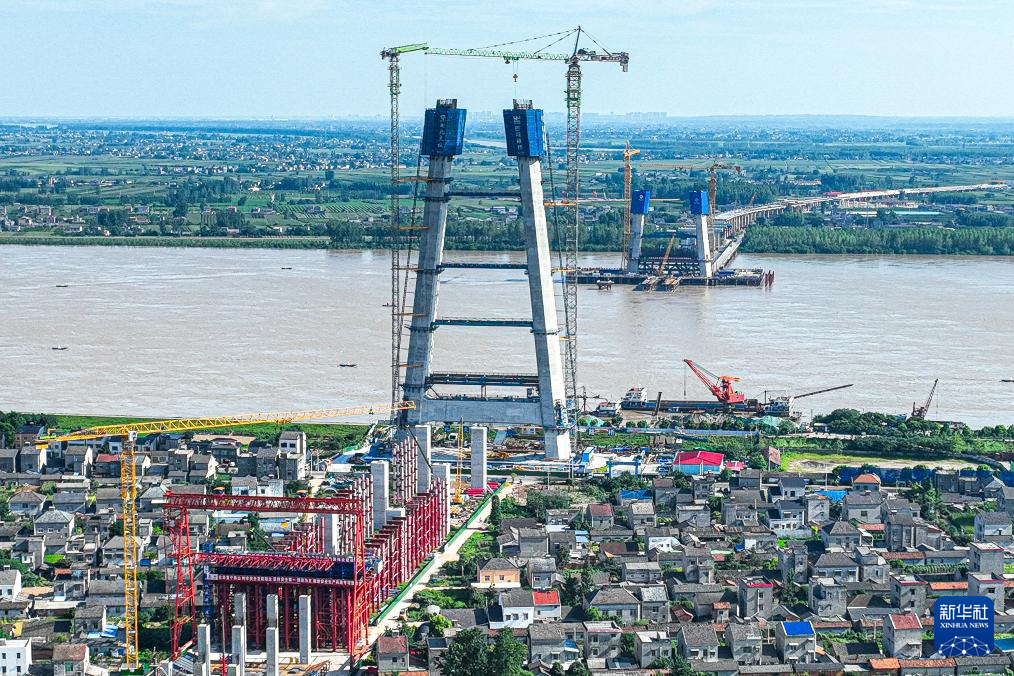 7月18日拍摄的湖北枝江百里洲长江大桥施工现场(无人机照片)。