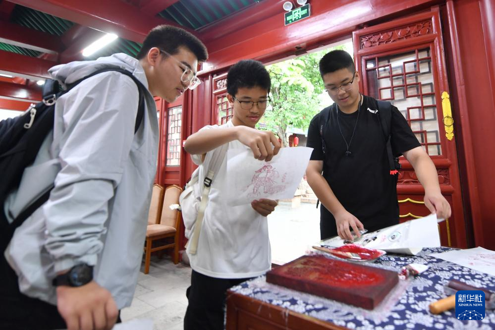 7月17日,在山东省青岛市民俗博物馆,三名高中生在体验拓印非遗木版年画。