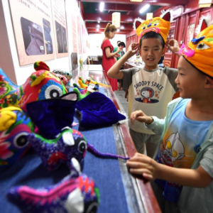 7月17日,在山东省青岛市民俗博物馆,两名小朋友在试戴非遗虎头帽。