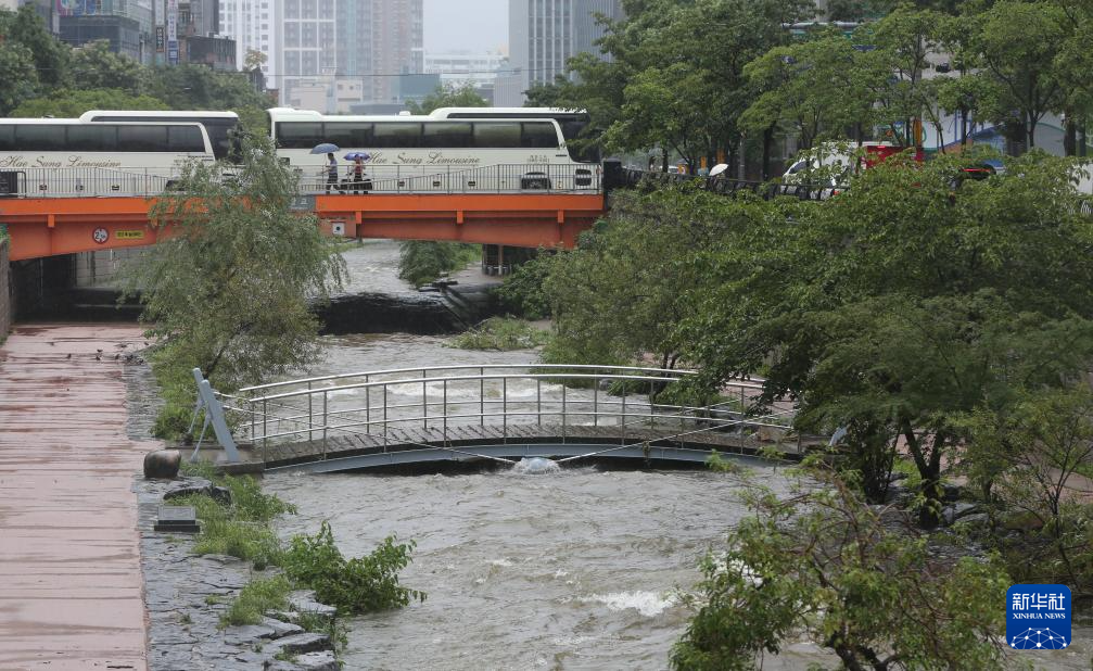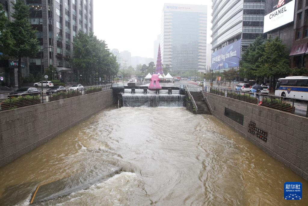 7月18日,由于持续降雨,韩国首尔的清溪川水位没过人行道。
