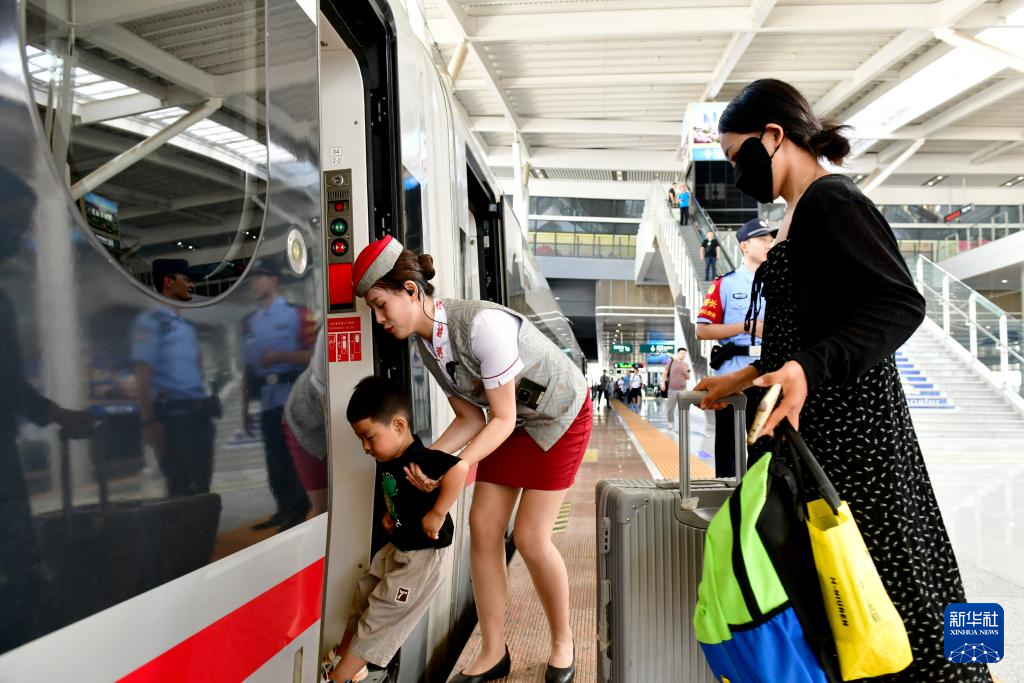 7月18日,在菏泽东站,工作人员帮助旅客登上G4007菏泽东至郑州东复兴号列车。
