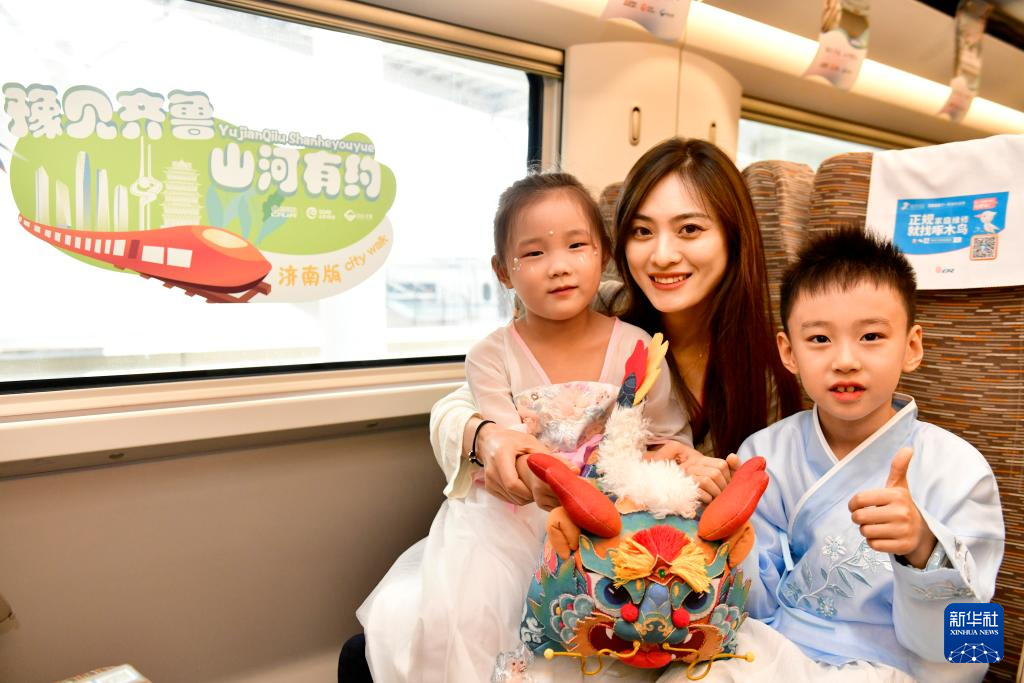 7月18日,在G4007菏泽东至郑州东复兴号列车上,来自山东菏泽的文艺工作者在进行文旅推介展演。