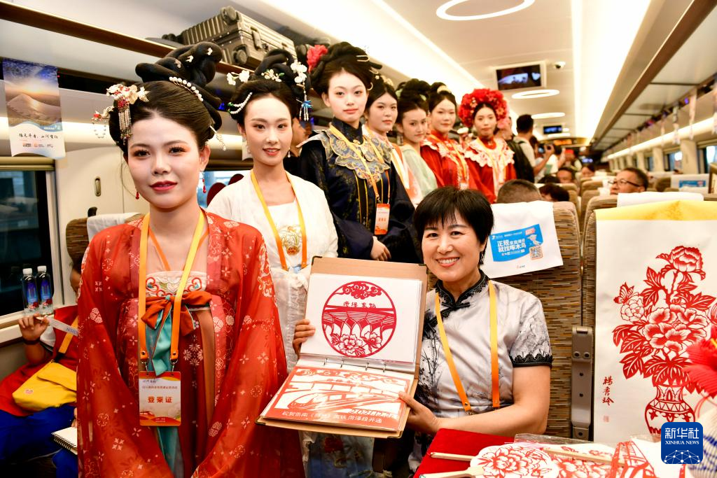 7月18日,在G4007菏泽东至郑州东复兴号列车上,非遗传承人杨秀玲(右)在展示自己为日兰高铁创作的剪纸作品。