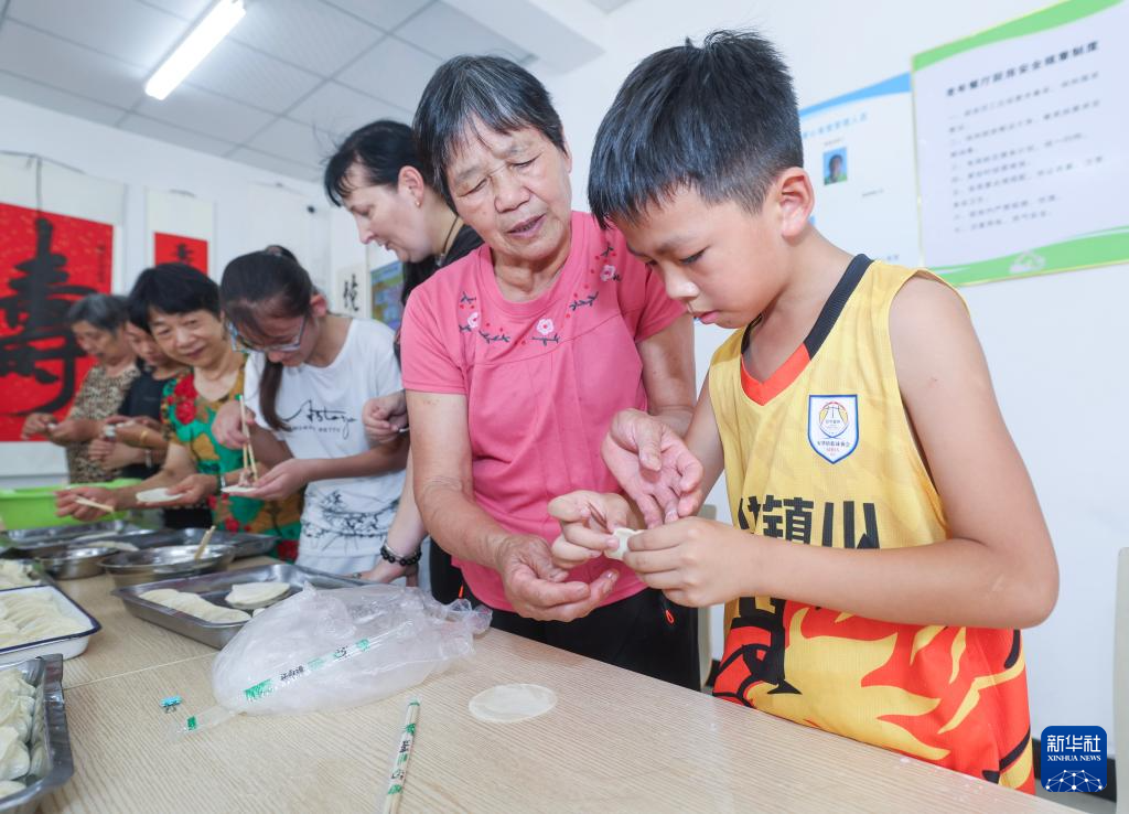 7月17日,在浙江省诸暨市安华镇,“小候鸟”们在社工站志愿者带领下包饺子。