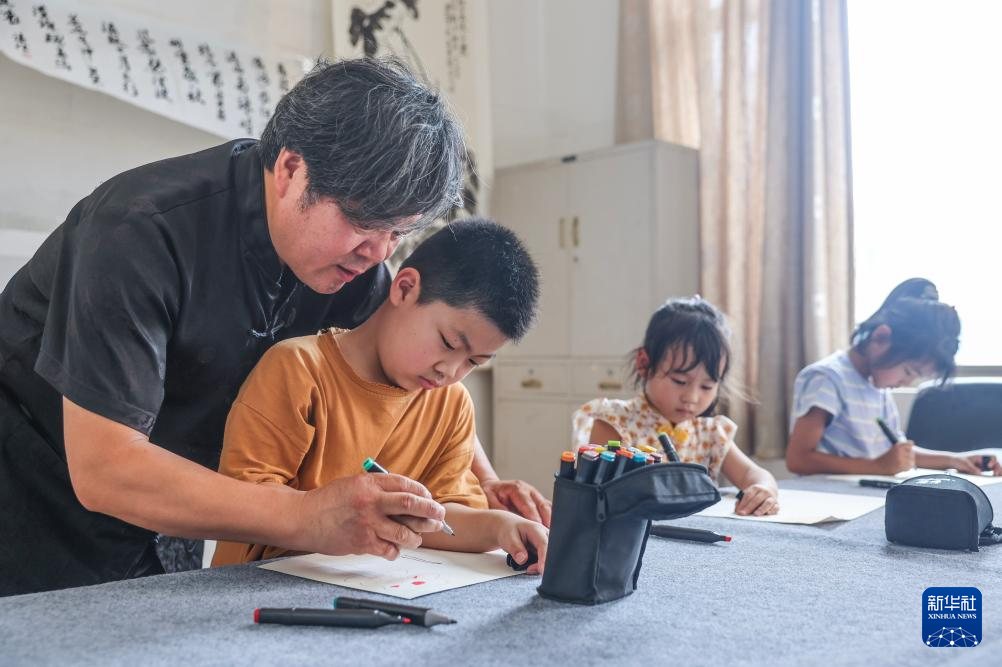 7月18日,在浙江省诸暨市安华镇的农家书屋内,“小候鸟”们在书画老师的带领下参加书画课。