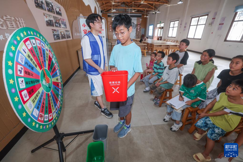 7月17日,在浙江省诸暨市安华镇的新时代文明实践所,“小候鸟”们在社工站志愿者带领下参加垃圾分类知识小游戏。