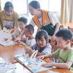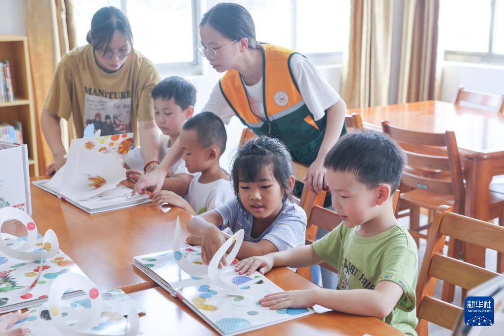 7月18日,在浙江省诸暨市安华镇的农家书屋内,“小候鸟”们在志愿者的带领下参加阅读体验课。