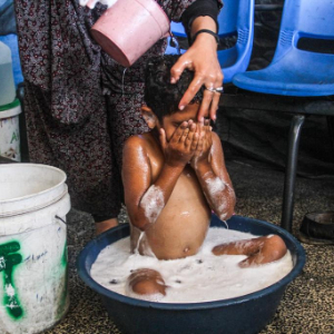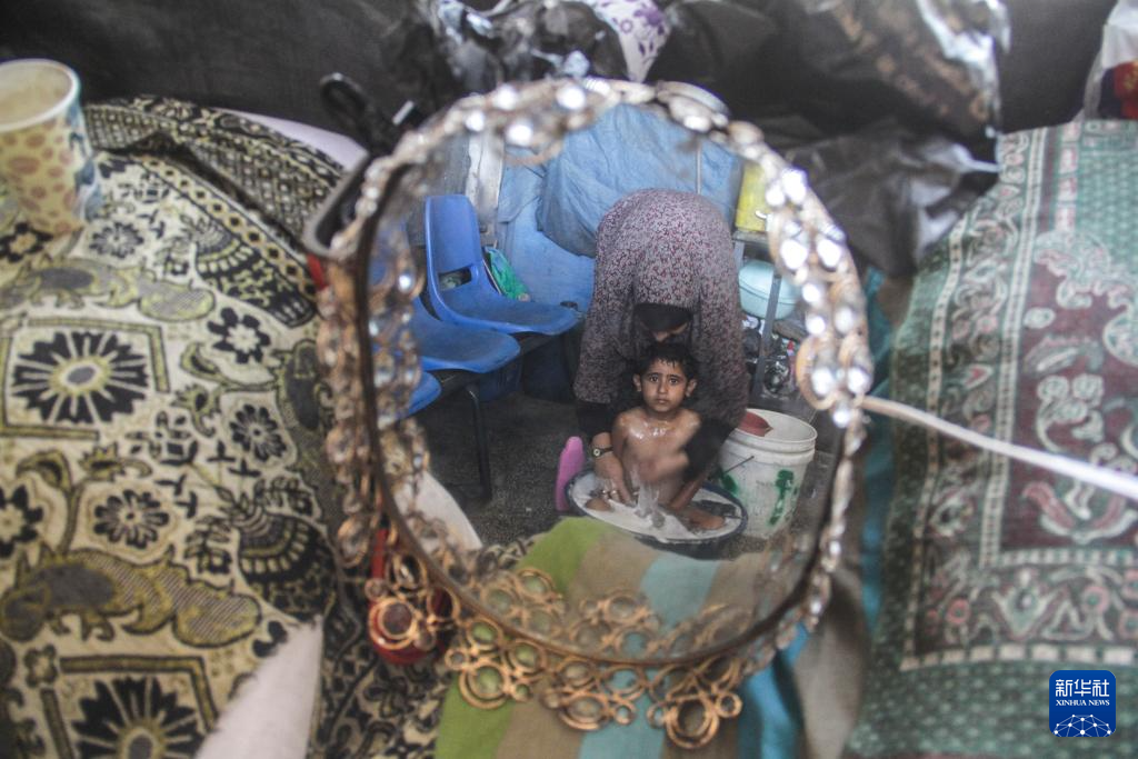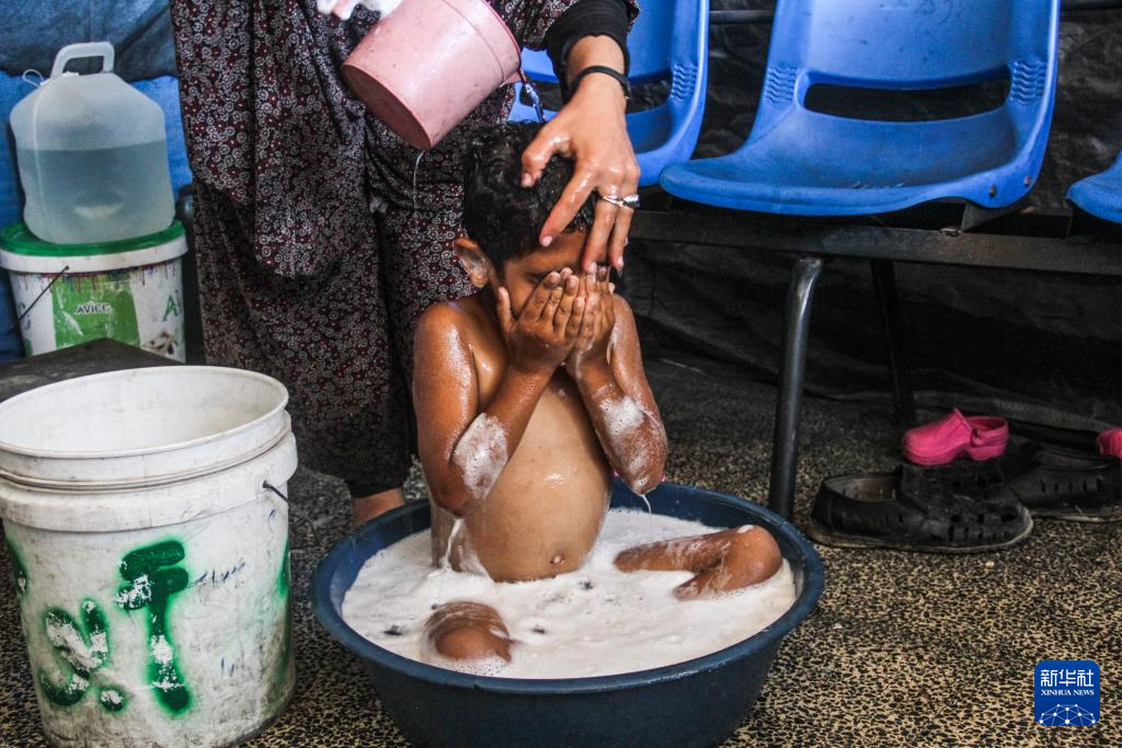 7月17日,在加沙地带北部,当地居民给儿童洗澡。