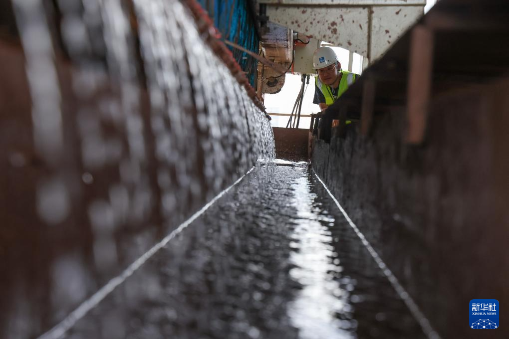7月18日,施工人员在盾构机尾指挥泥水渣土运输车接收盾构机输出的盾构弃渣。