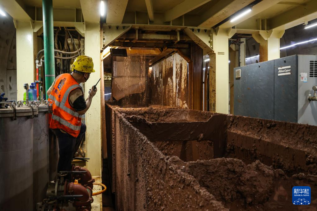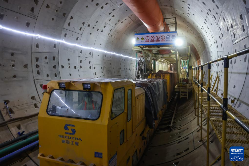 7月18日,泥水渣土运输车在隧道内接收盾构机输出的盾构弃渣。