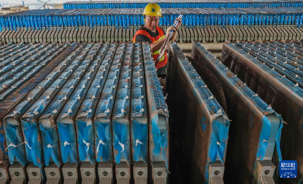7月18日,施工人员在芳白城际六工区污水处理厂泥水压滤产线清理污水压滤后产生的泥饼。
