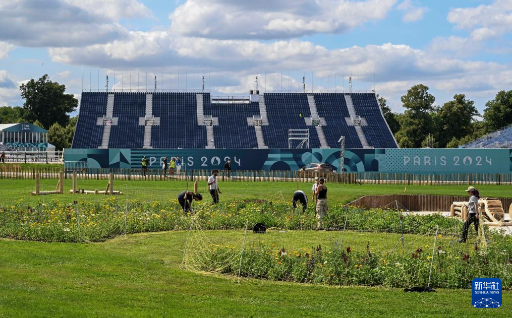 7月17日,工作人员在马术赛场布置场内景观。
