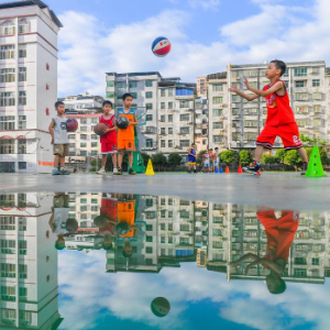 7月19日,在湖南省永州市道县树湘学校篮球训练营,孩子们参加篮球训练。