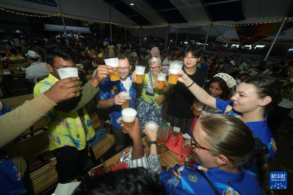 7月19日,人们在第34届青岛国际啤酒节崂山会场举杯庆祝。