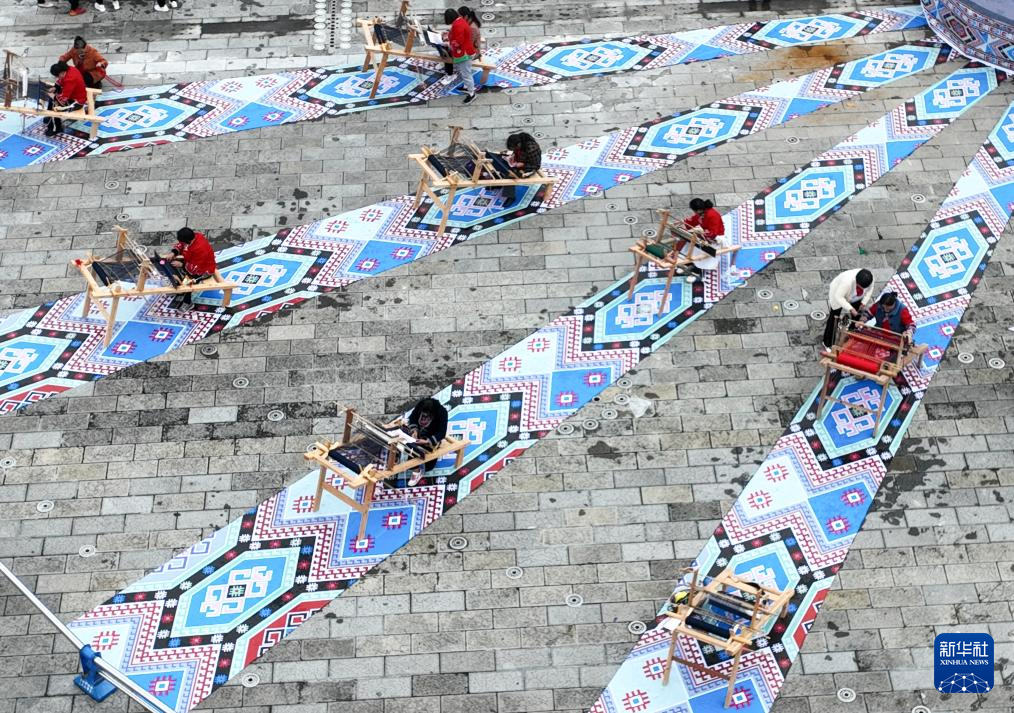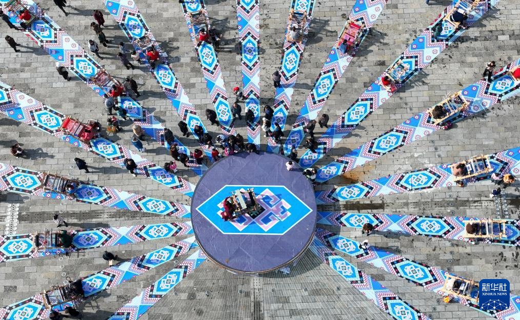 织锦女工在来凤县龙凤文化中心广场现场制作西兰卡普,展示非遗技艺(2023年10月28日摄,无人机照片)。