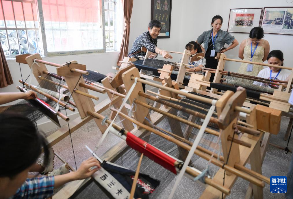 7月2日,唐洪祥的老伴刘秀琴(后左一)指导前来学艺的学员们操作织机。